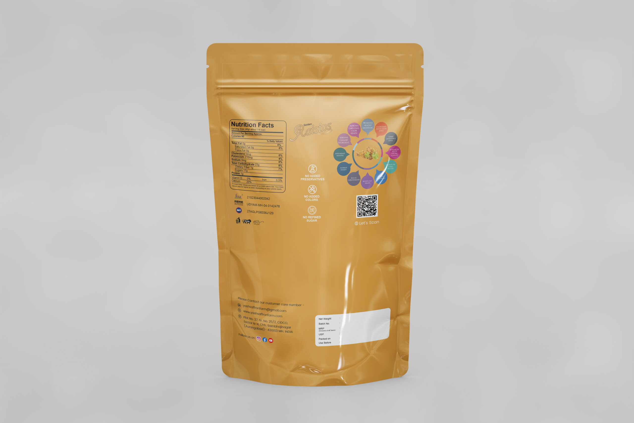 Our golden raisins, offered by Yash Saffron Farm in 1Kg, 500gm, 400g, 200gm packs, have a naturally sweet flavor and chewy texture. Rich in antioxidants and essential vitamins, they’re great for snacking or adding a touch of sweetness to salads and desserts.